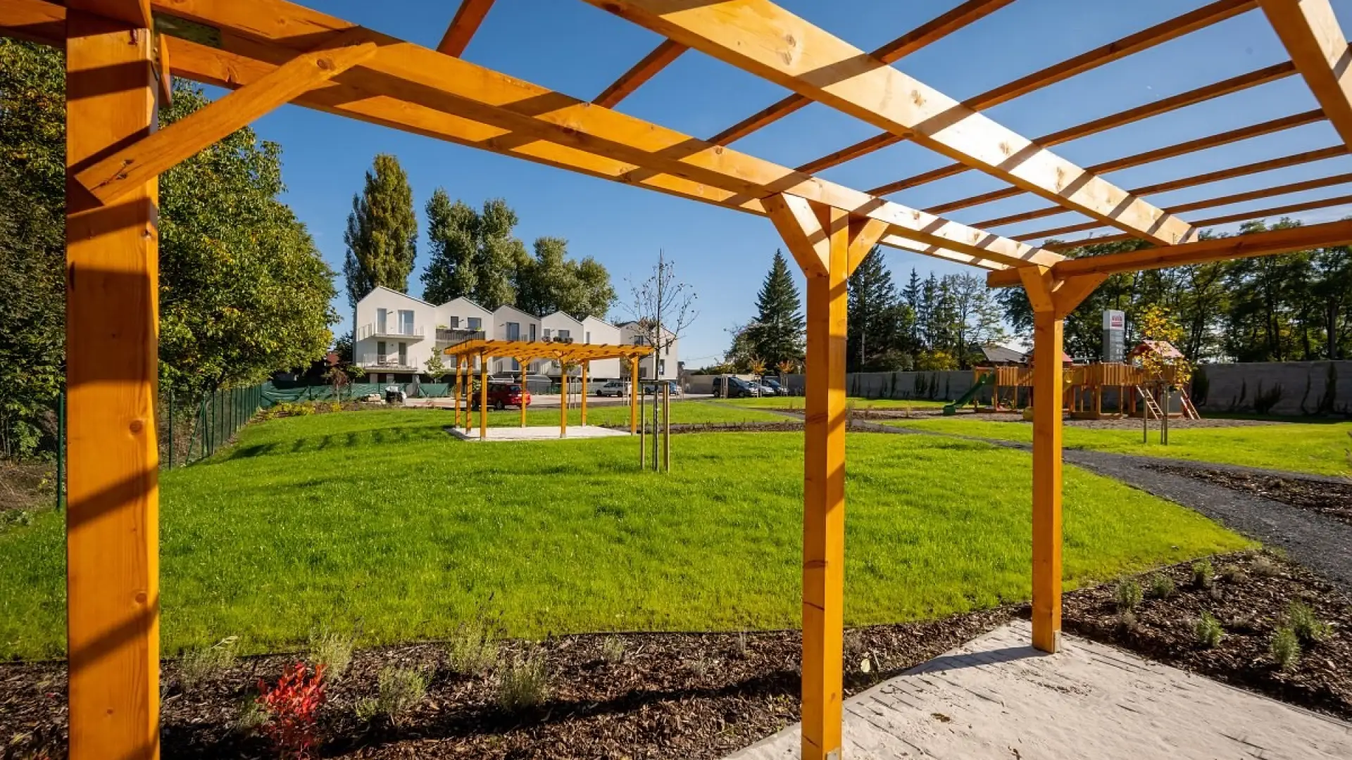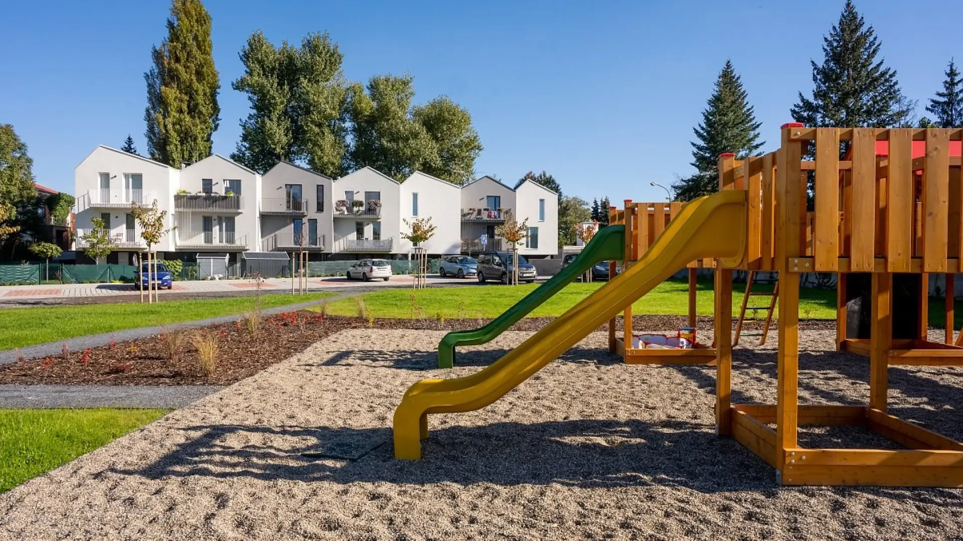 Nízkoenergetická stavba s originálním designem je zasazena do soukromého uzavřeného komplexu s výměrou 4 500 m2, který tak poskytuje svým obyvatelům naprosté soukromí. Samozřejmostí je jediný vstup na pozemek zpřístupněný buďto čipem majitelů bytů, nebo videotelefonem přímo z bytu. Součástí komplexu je také dětské hřiště, na kterém se malí dvojnožci do sytosti vyzlobí, anebo odpočinková zóna pro unavené rodiče.
