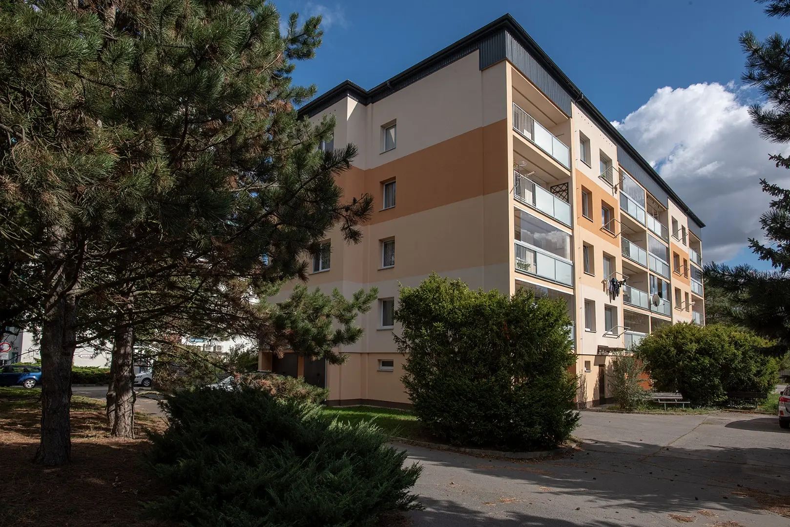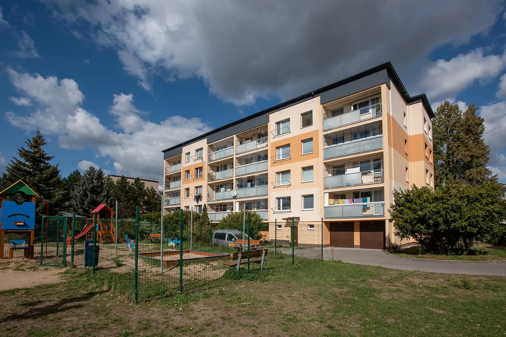 Opravená fasáda ve světlém odstínu a decentní okolí působí velmi příjemným dojmem. Povedené dílo. Nahlédněte a posuďte sami.