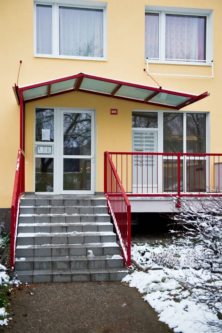 Nad všemi vstupy do objektu byly osazeny nové ocelové stříšky s výplní z tvrzeného skla. Byl vystavěn nový okapový chodníček.