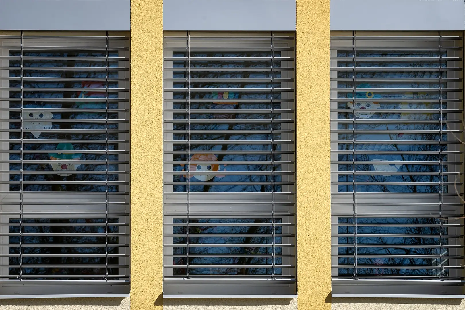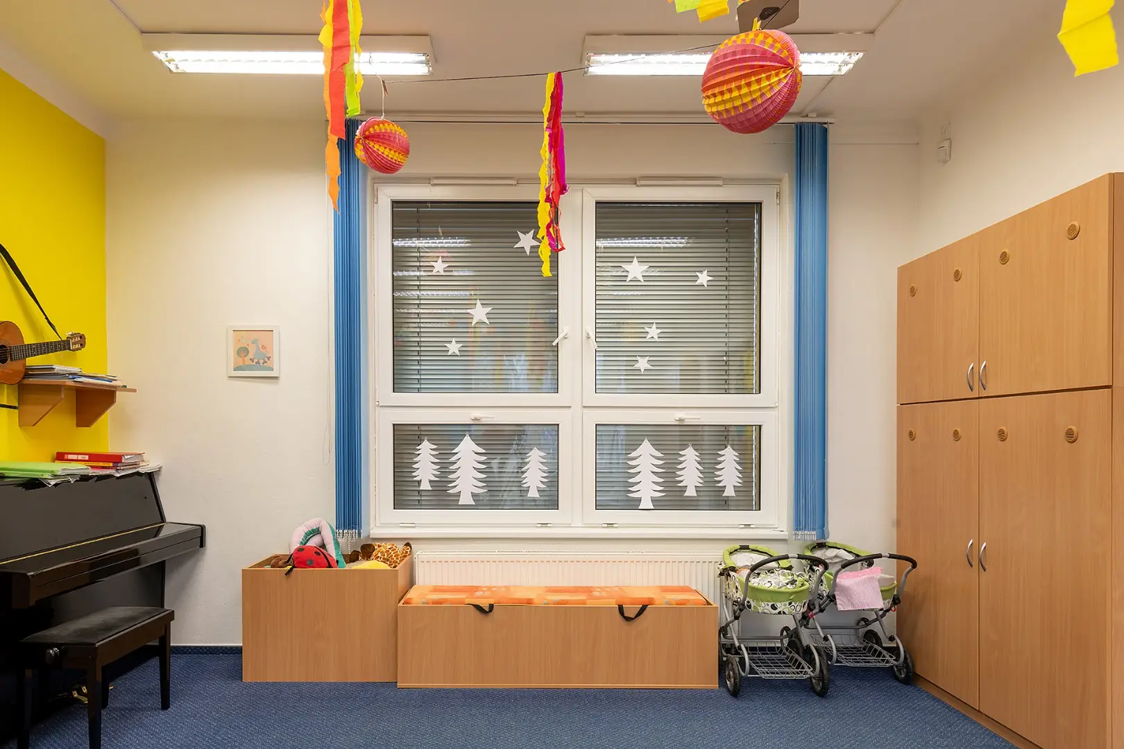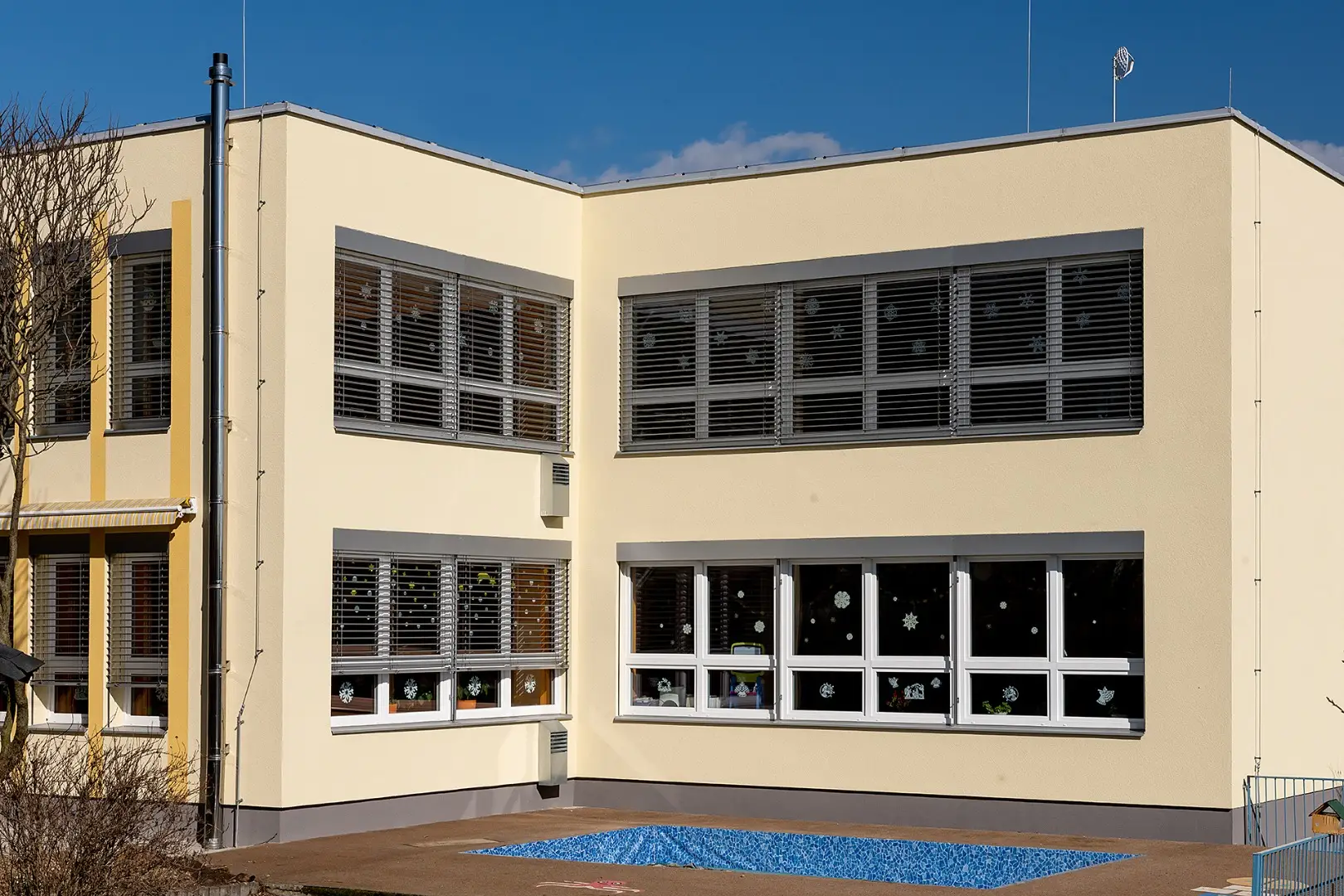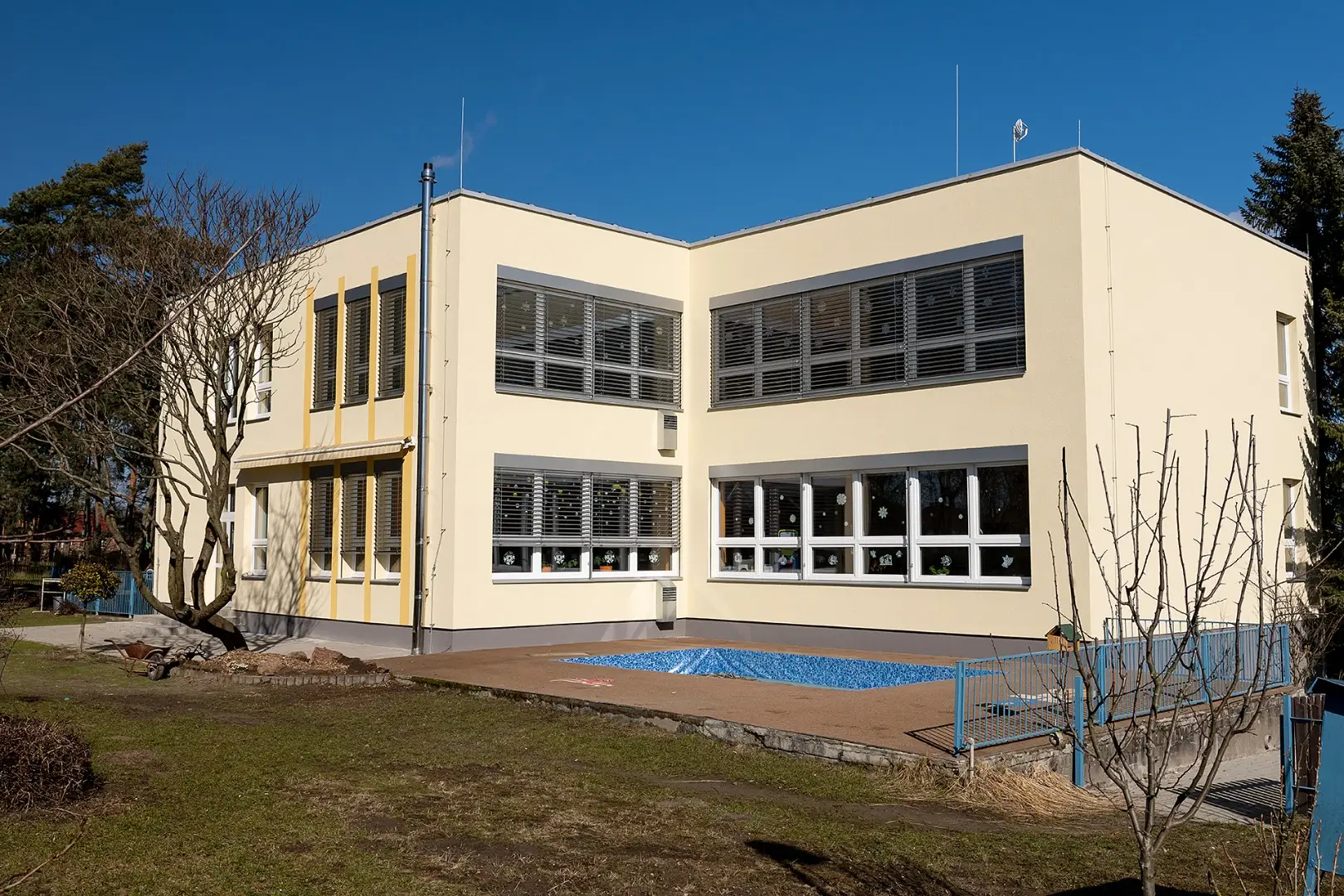 Naopak nadměrným tepelným ziskům v letním období brání vnější žaluzie, které jsou osazeny na oknech nejvíc prosluněných fasád školky.