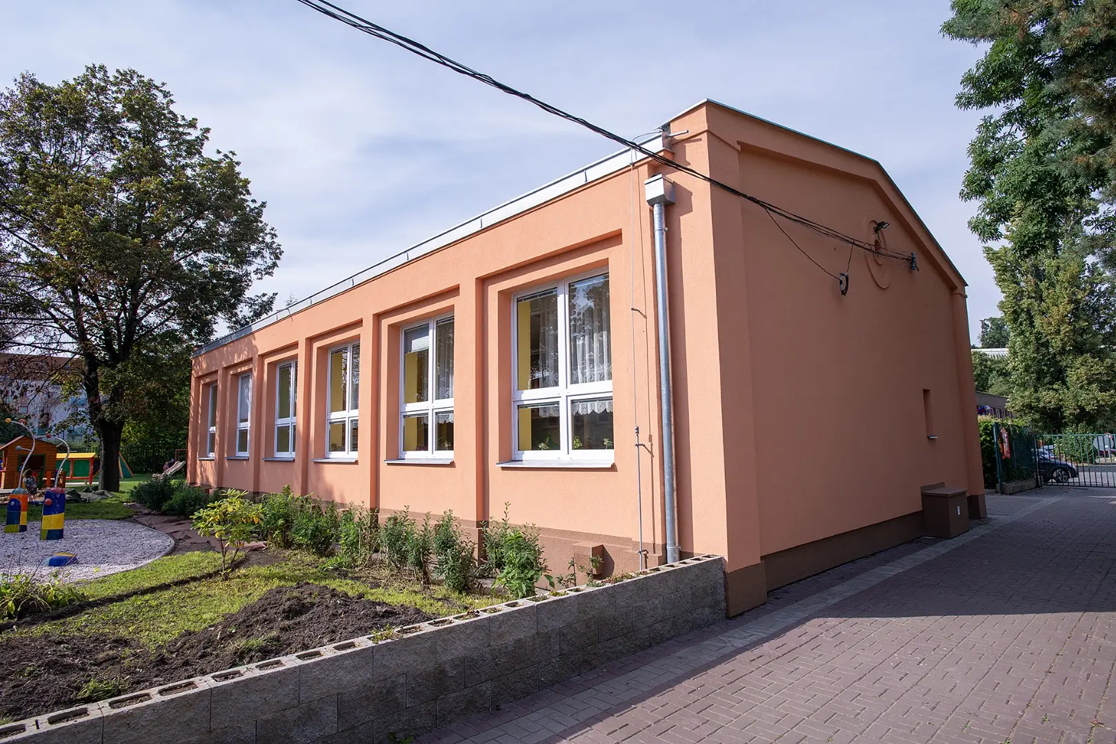 Zateplení fasády probíhalo na třech nezávisle stojících pavilonech mateřské školy. Její zateplení bylo realizováno kontaktním zateplovacím systémem Klasik Weber s certifikací dle ETAG. Po ukončení školního roku byla školka svěřena do naší péče. Po přípravných pracích, jako odstranění křovin a stromů kolem fasády pavilonů, oprava či odstranění poškozených omítek a postavení lešení. Byla zahájena práce na hlavním úkolu celého projektu a to, zateplení hlavních fasád, kde byl použit izolační materiál polystyrén EPS v tl. 120 mm, vystouplé části, byli zatepleny šedým polystyrénem EPS tl. 100 mm. Hmoždinky NTK U s plastovým trnem. Žebra římsy byli zatepleny izolantem tl. 20 mm, sokl perimetrem tl. 80 mm. Na závěr byla použita tenkovrstvá silikonová zrnitá omítka tl. 1,5 mm, v barevnosti v odstínech přibližujících se původním odstínům. V rámci rekonstrukce byli vybourány kovové žebříky a zábradlí, které byli nahrazeny za nové.