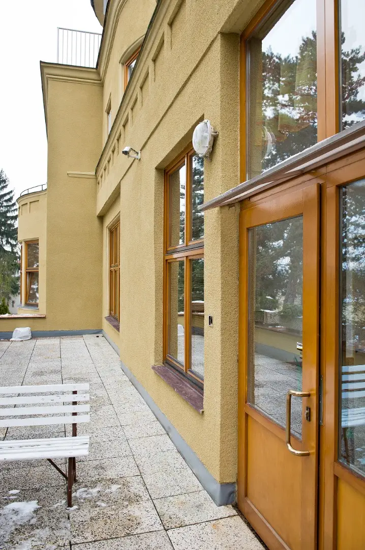 Po omytí tlakovou vodou stávající probarvenou silnovrstvou omítku byly stěny fasády opatřeny difúzní penetrací Quick-mix ATG. Lokální opravy porušené omítky byly provedeny z velmi kvalitní minerální renovační omítky vyztužené vlákny Quick-mix MFR, která je určená k lokálním opravám historických fasád. Zateplení fasády pravého křídla vily proběhlo extrudovaným polystyrenem XPS tl. 80 mm včetně lepidla a kotev. Závěrem byla nanesena nová škrábaná probarvená tenkovrstvá omítka pro sjednocení celkového dojmu. Na exteriéru budovy byla také upravena elektroinstalace světel a přívod zvonkového tabla pod úroveň omítky.