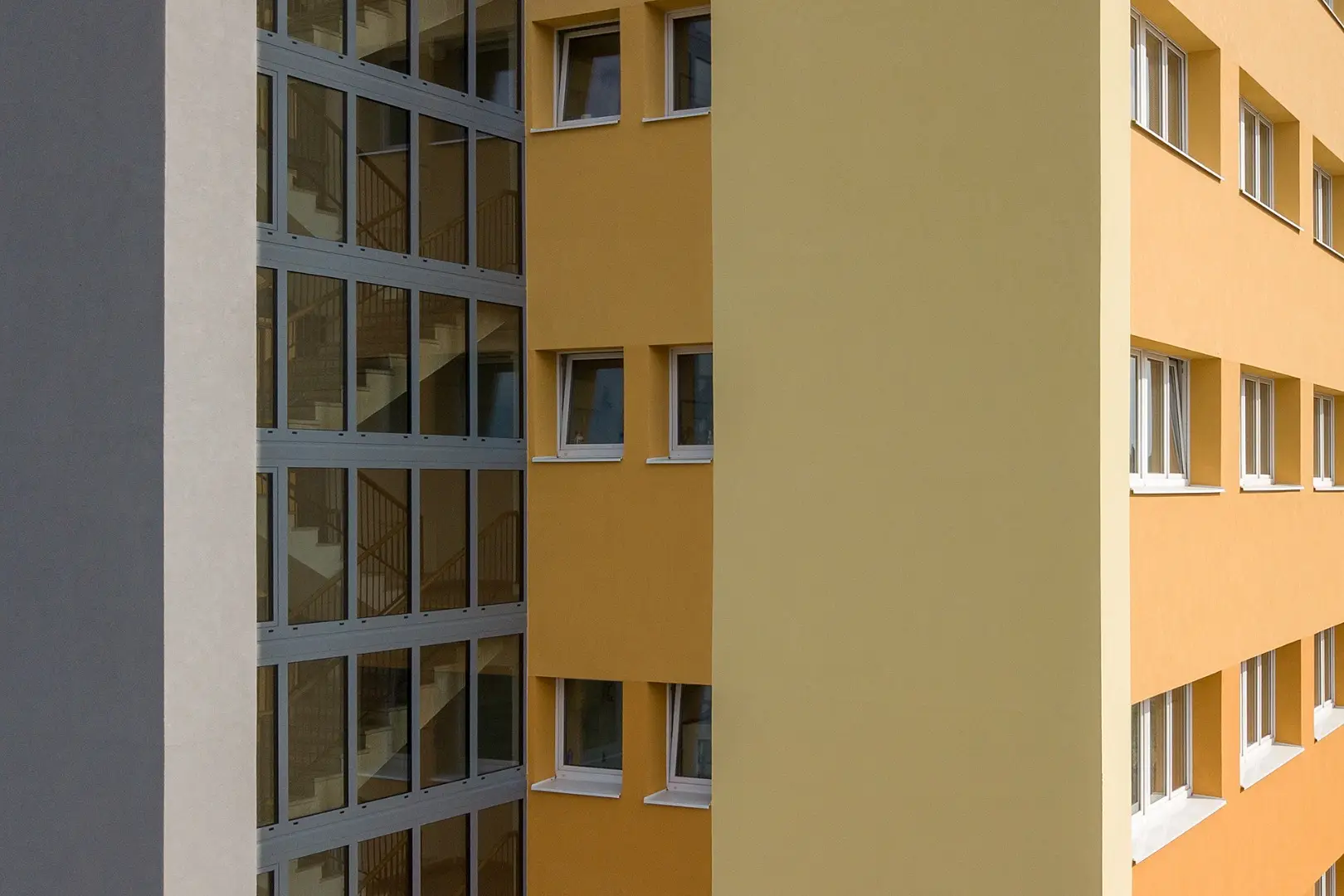 Fasádní omítkovou vrstvu tvoří silikonová probarvená omítka a sokl chrání odolná omítka z drcených mramorových kamínků. Soklová část je také opatřena ochranným antigraffiti nátěrem, až do výše 4m od terénu.