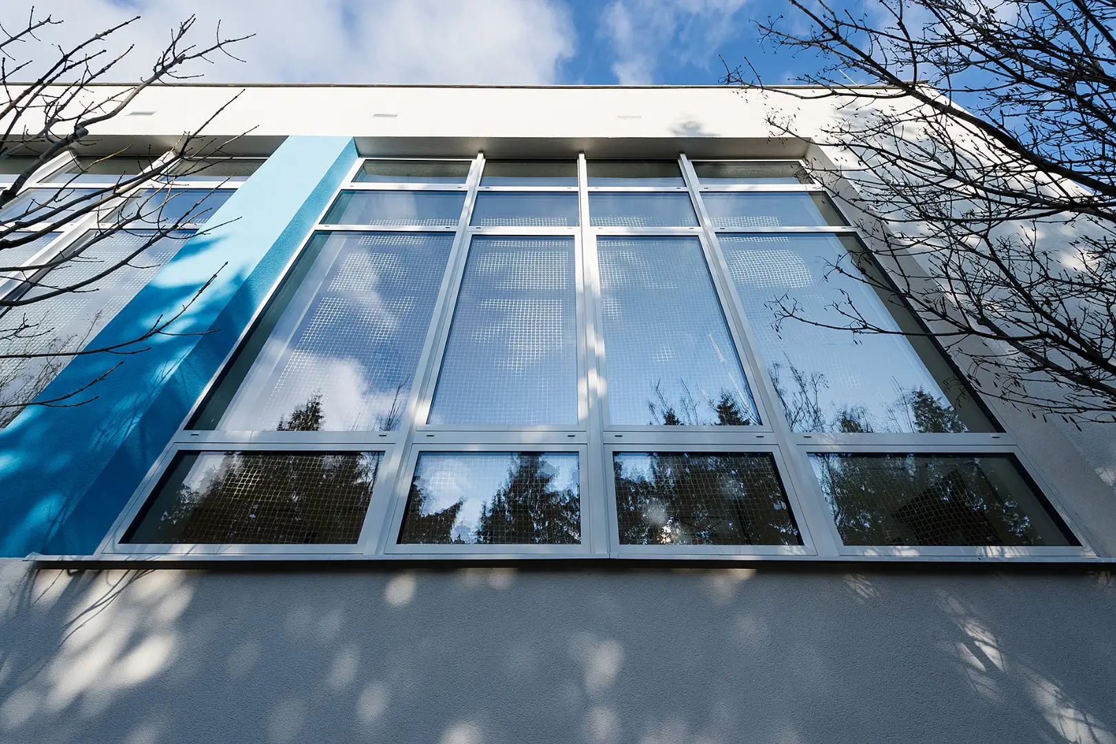 V 2.-4. nadzemním podlaží hlavní budovy budovy a v 1. nadzemním patře budovy spojovacího krčku se nachází předsazený montovaný plášť z boletických panelů. Panely byly již dožilé a docházelo k vypadávání skleněných výplní, nesplňovali tepelně-technické požadavky a obsahovali škodlivý azbest. Z těchto důvodů bylo demontováno opláštění panelů, včetně tepelné izolace. Nosný rošt panelů kotvený k nosné konstrukci budovy byl zachován. Následně bylo namontováno nové opláštění na stávající rošt, tvořené z interiéru sádrokartonovými deskami a z exteriéru sádrovláknitými deskami. Prostor mezi rámy byl vyplněn minerální vatou tloušťky 80 mm a na sádrovláknitou desku byl zvenku aplikován certifikovaný systém kontaktního zateplení z fasádního polystyrenu tloušťky 160 mm. Meziokenní sloupky byli zatepleny zateplovacím systémem z fenolické pěny tloušťky 120 mm pro dosažení menší tloušťky izolantu a funkcionalistickému vzhledu pásových oken. Zděné obvodové konstrukce byly zatepleny certifikovaných systémem kontaktního zateplení z fasádního polystyrenu tloušťky 160 mm. Byl také upraven přístřešek před hlavním vstupem.