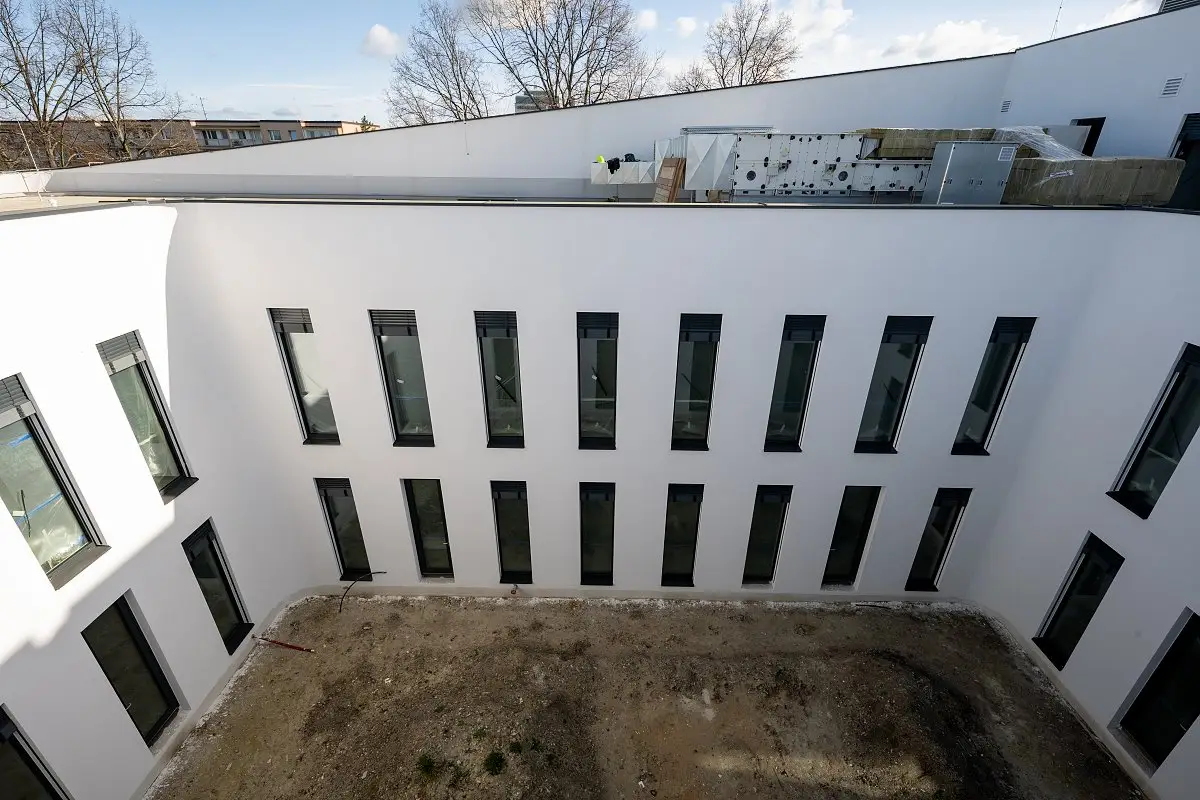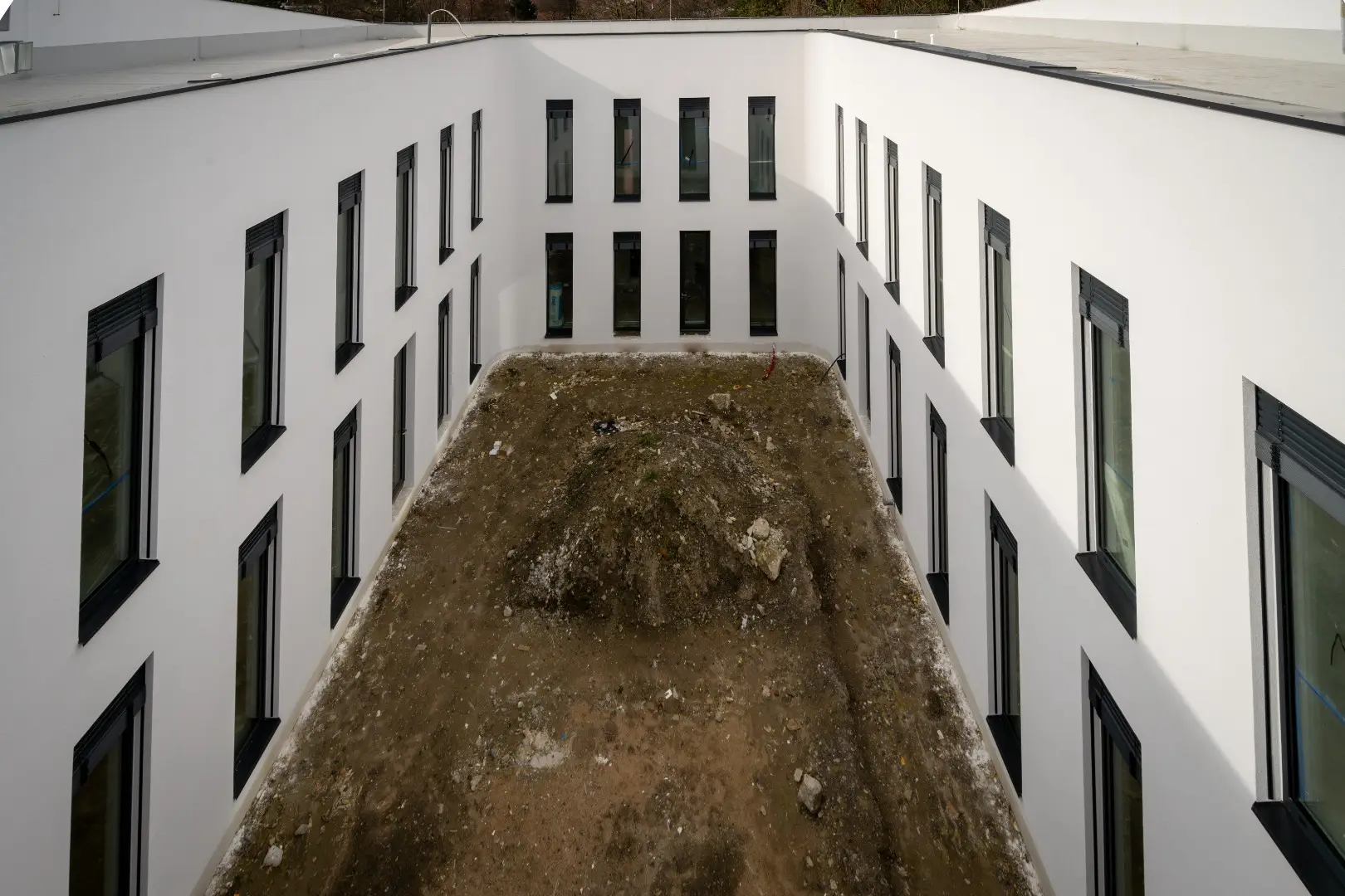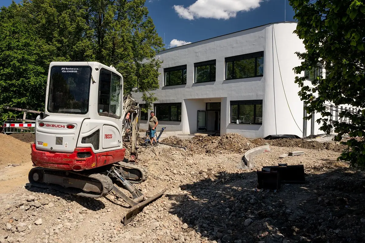 Dalším důležitým prvkem, který přispívá k celkovému pohodlí a kvalitě prostředí, je atrium. Zde v současnosti provádíme zemní práce a úpravy terénu. Toto centrální prosvětlené prostranství zajistí dostatek denního světla ve všech částech budovy a zároveň bude sloužit jako příjemné místo setkávání a odpočinku.