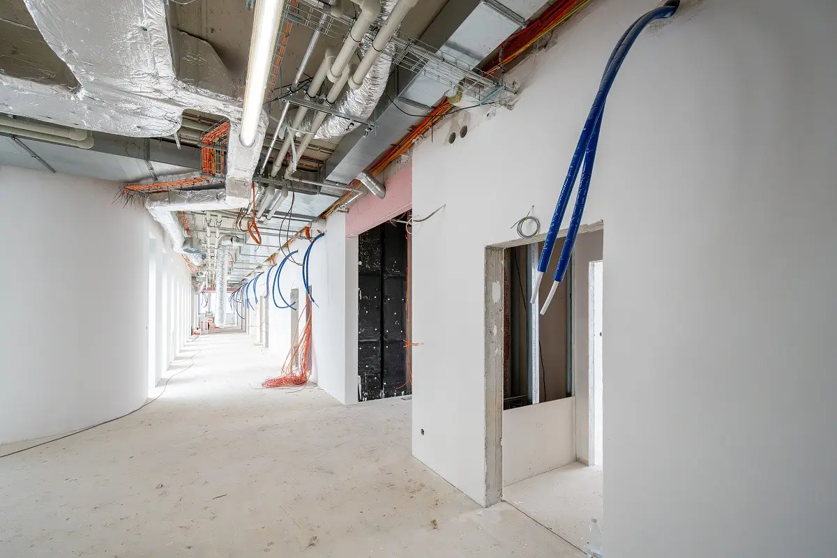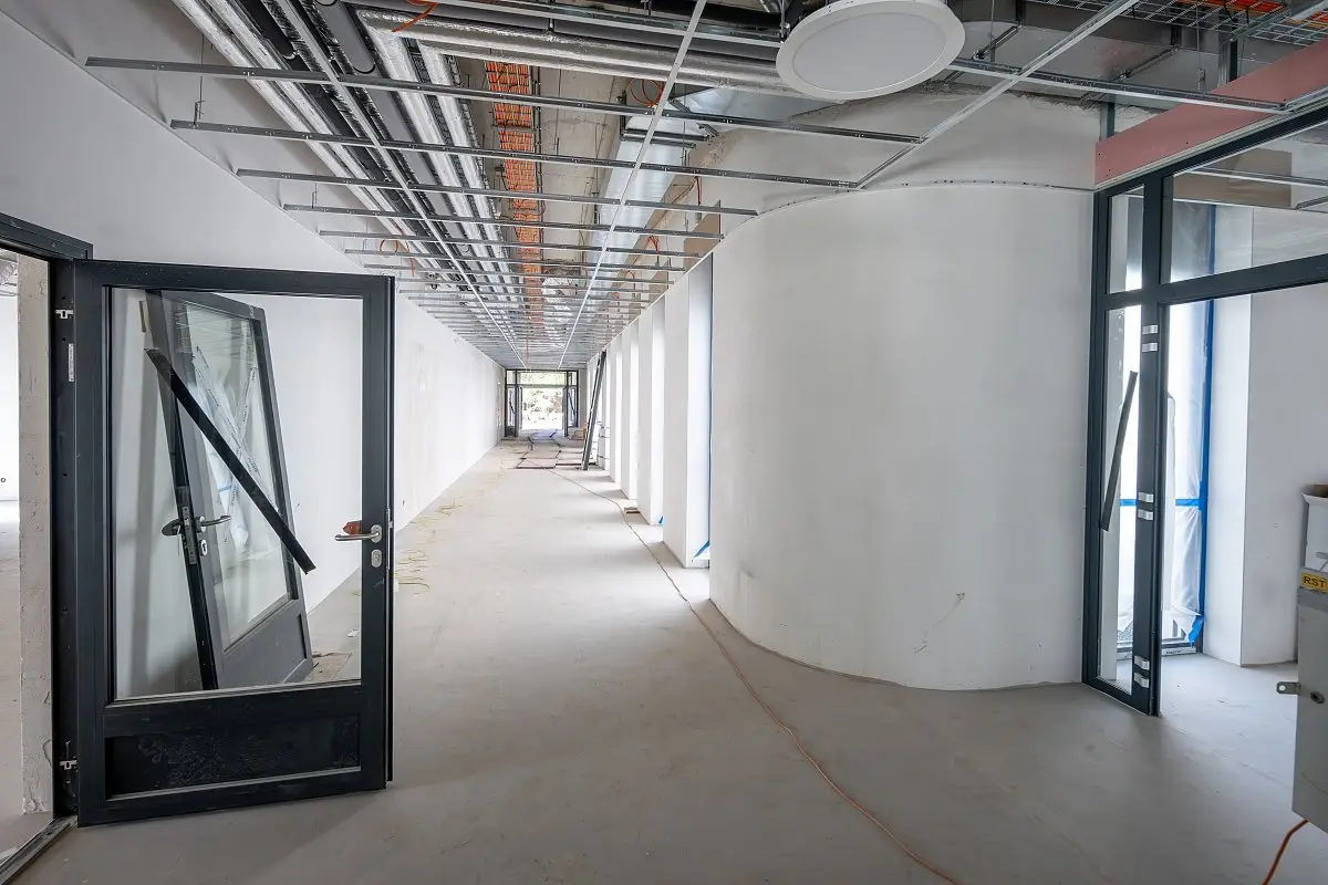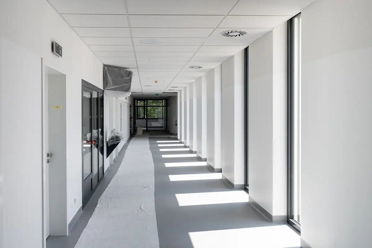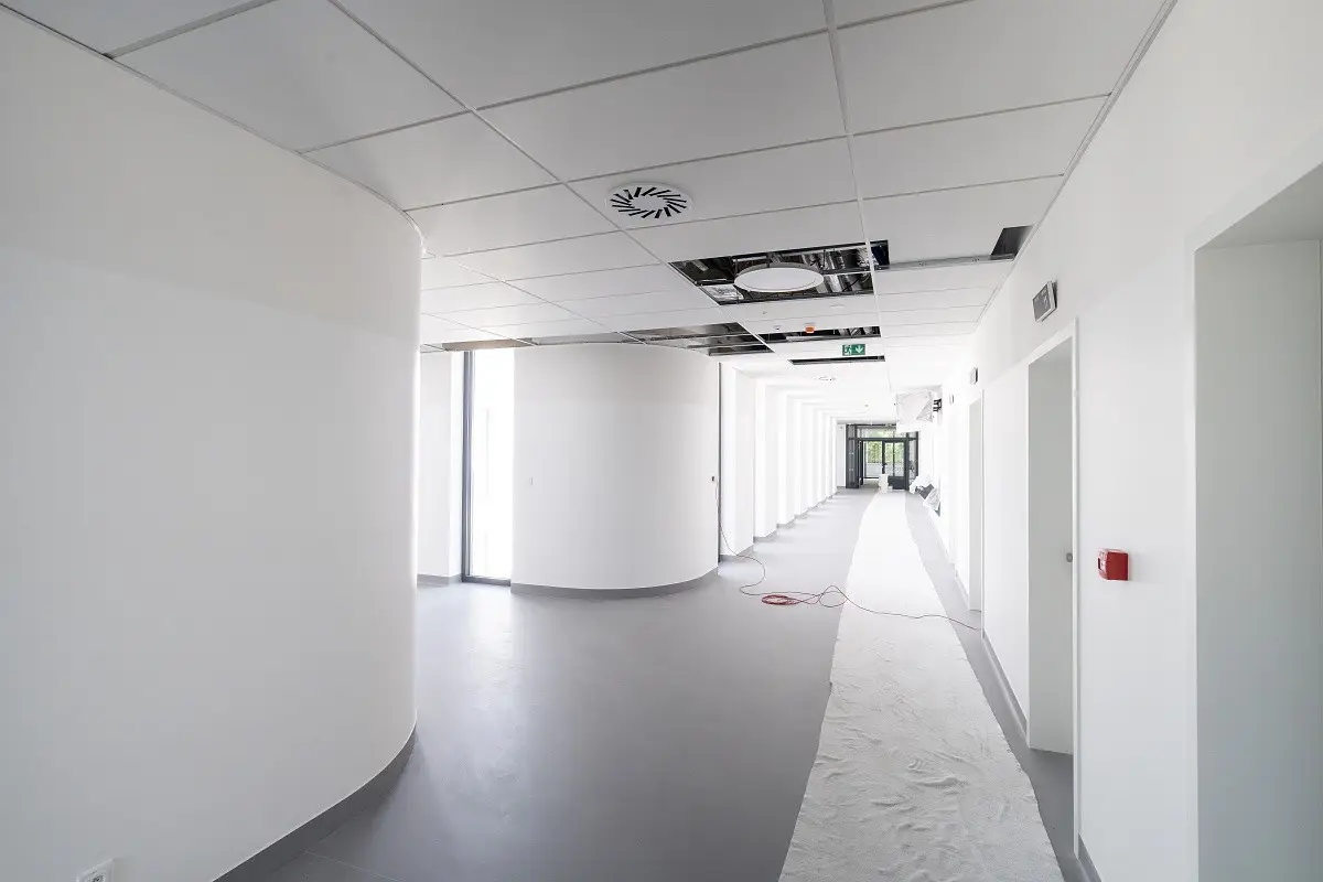 Vnitřní prostory polikliniky jsou rovněž ve finální fázi dokončení. Práce na instalaci zárubní dveří, stropních sádrokartonových konstrukcí a podhledů na chodbách jsou již téměř ukončeny. Pokládka finální PVC krytiny na podlahy je dalším krokem směrem k dokončení interiéru a připravenosti budovy k přijetí pacientů a návštěvníků. Zároveň se věnujeme i zpevněným plochám kolem budovy, přičemž se zaměřujeme na vyprojektované chodníky, ochozy a parkovací místa. Ty zajistí bezpečný a pohodlný přístup k poliklinice.