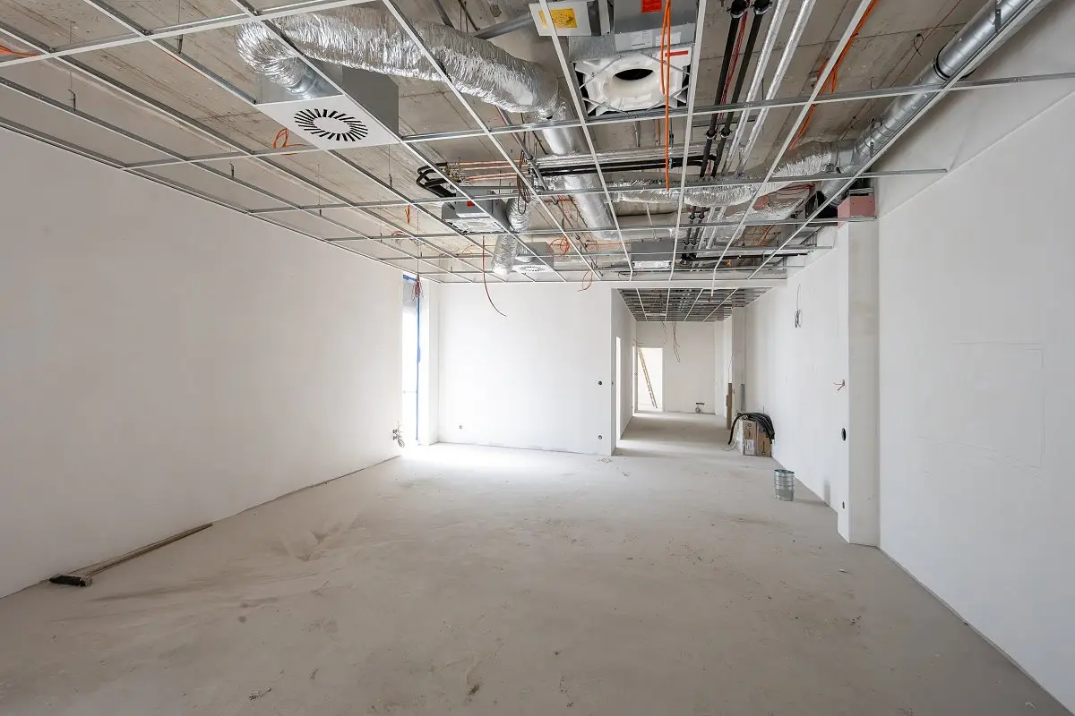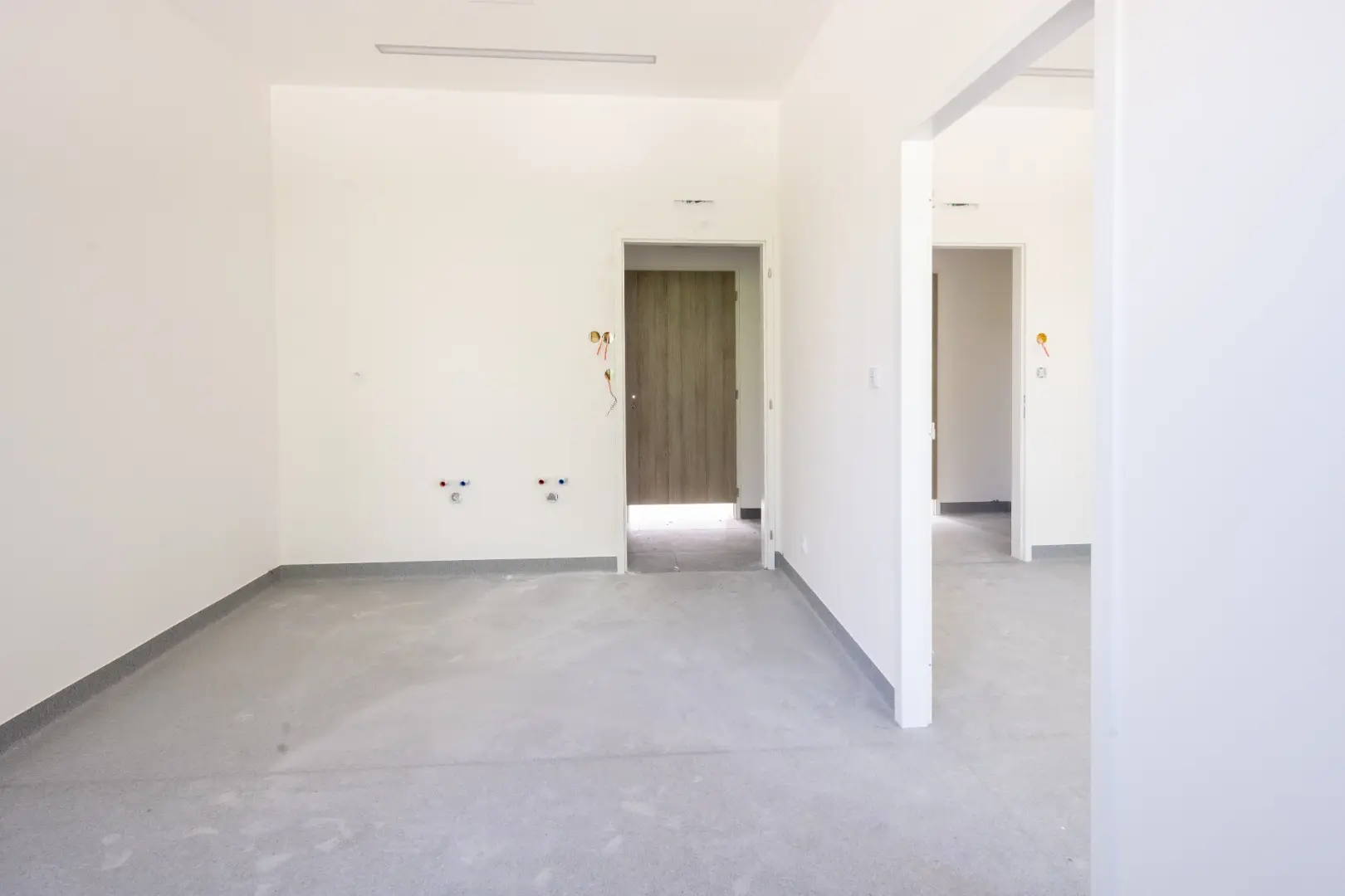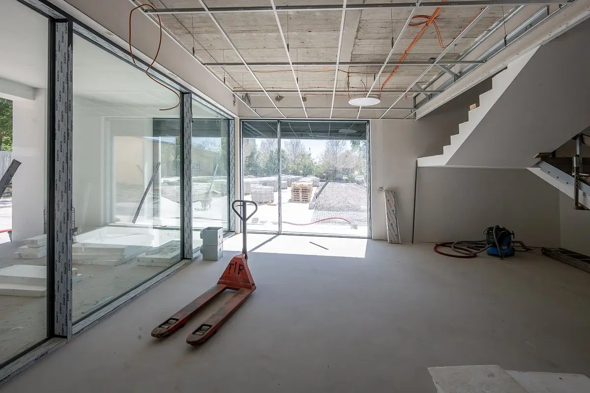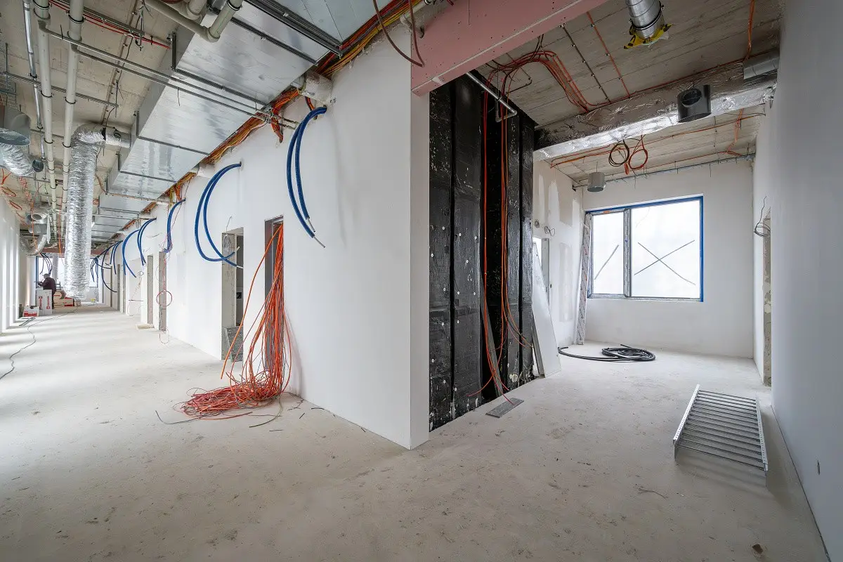 Vnitřní prostory polikliniky jsou rovněž ve finální fázi dokončení. Práce na instalaci zárubní dveří, stropních sádrokartonových konstrukcí a podhledů na chodbách jsou již téměř ukončeny. Pokládka finální PVC krytiny na podlahy je dalším krokem směrem k dokončení interiéru a připravenosti budovy k přijetí pacientů a návštěvníků. Zároveň se věnujeme i zpevněným plochám kolem budovy, přičemž se zaměřujeme na vyprojektované chodníky, ochozy a parkovací místa. Ty zajistí bezpečný a pohodlný přístup k poliklinice.