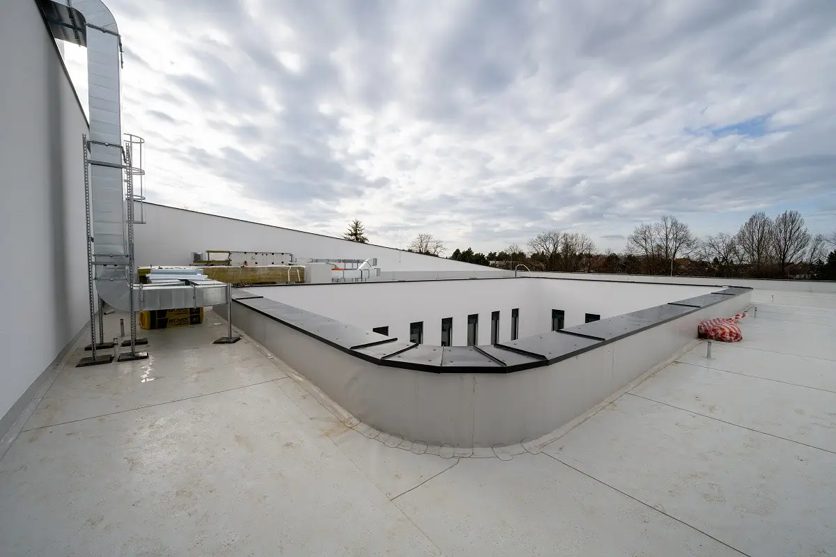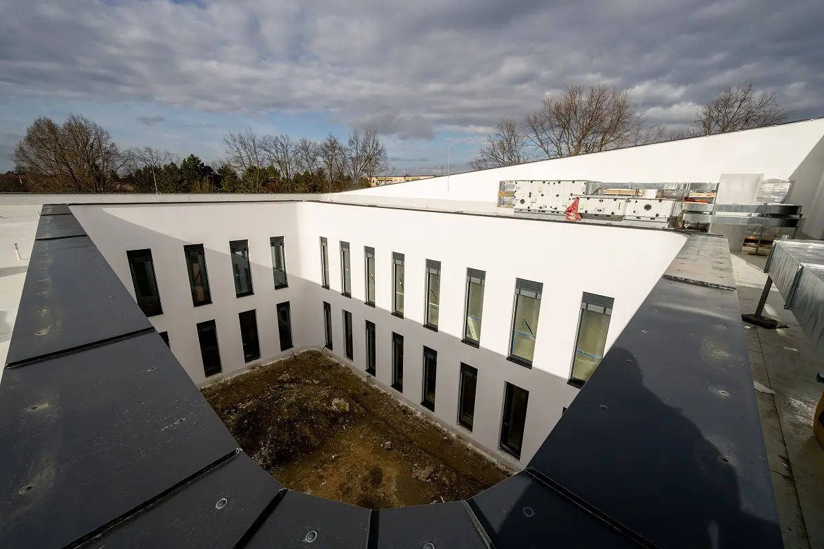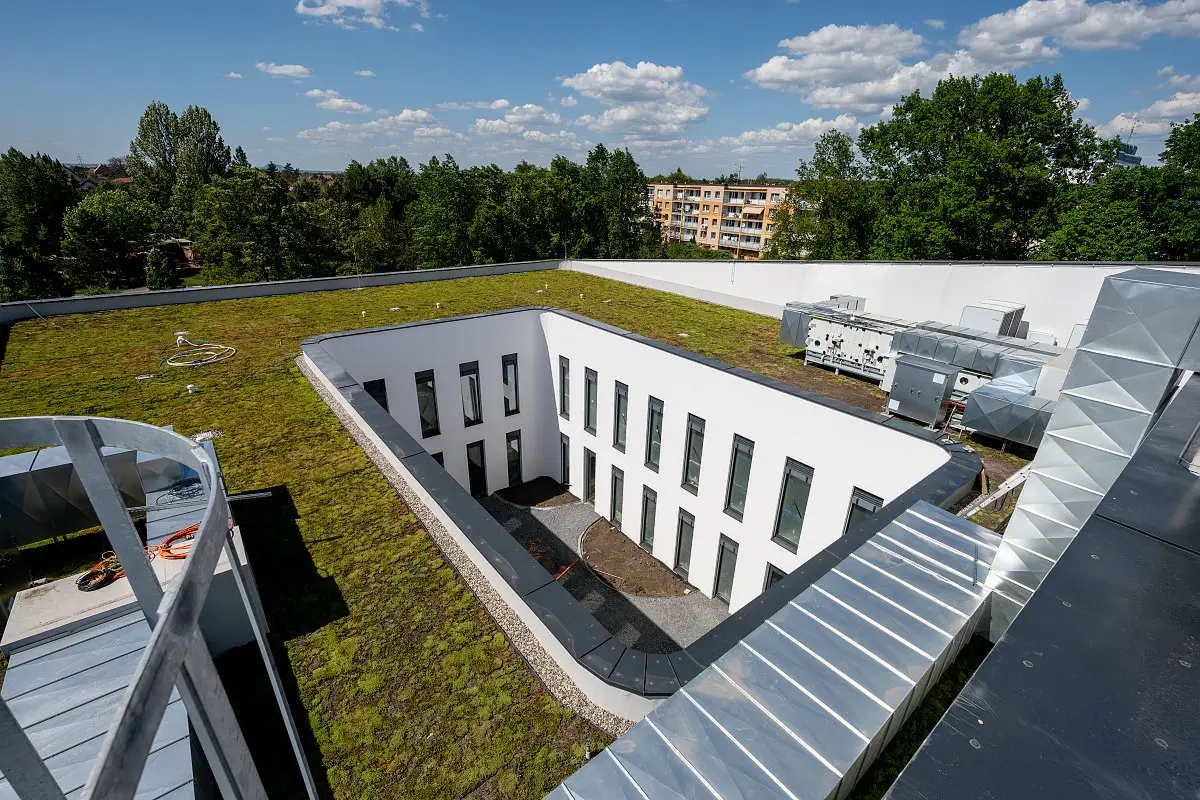 V současné fázi prací se již blížíme ke konečné podobě budovy. Práce na vnějším vzhledu spojené s instalací zelené střechy jsou téměř dokončeny. Volba zelené střechy není náhodná – přináší významné ekologické a funkcionální výhody. Kromě zlepšení mikroklimatu a eliminace hluku zelená střecha také přispívá k lepší tepelné izolaci budovy, což zajišťuje komfortní prostředí v létě i v zimě.
